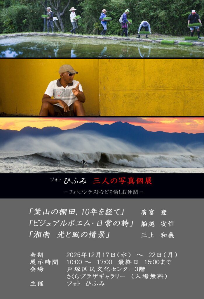 【内容】廣富 登「葉山の棚田、10年を経て」、船越 安信「ビジュアルポエム、日常の詩」、三上 和義「湘南 光と風の情景」。